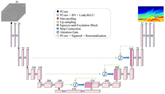 The PCAMUNet, following the PConv down-sampling operator, is structured into two primary components: an encoder dedicated to feature extraction and a decoder tasked with velocity model feature reconstruction. The encoder includes 4 down-sampling modules, each equipped with 2 PConv blocks and a 2 × 2 max-pooling layer, doubling the feature channels while halving the spatial dimensions. Conversely, the decoder fuses low-resolution maps with encoded spatial information to produce high-resolution feature maps. After each up-sampling module, the channel number halves while feature map size doubles. The first three up-sampling modules each consist of a 2 × 2 up-sampling layer, 2 PConv blocks, and a skip connection, whereas the final up-sampling module excludes the skip connection to avoid source footprint artifacts. Prior to the skip connection, AG mechanisms learn weight coefficients to modulate the down-sampled feature maps, highlighting important areas and suppressing trivial regions. Therefore, this process ensures that concatenated features retain essential spatial information, enhancing the learning capabilities of the PCAMUNet. Following the final up-sampling module, the SE channel attention block dynamically adjusts feature channels, making the features focus on the most important information. This improvement is inspired by the observation that the channel feature maps produced by the final up-sampling module focus on distinct regions of the output velocity model. In the last layer, a Sigmoid function is employed to normalize the feature values, followed by a denormalization step that adjusts the value range of the velocity model. Each PConv block comprises a 3 × 3 PConv operator, a batch normalization (BN) layer, and Leaky ReLU activation function. The numbers atop the cube in Figure 3 are the quantity of feature channels.