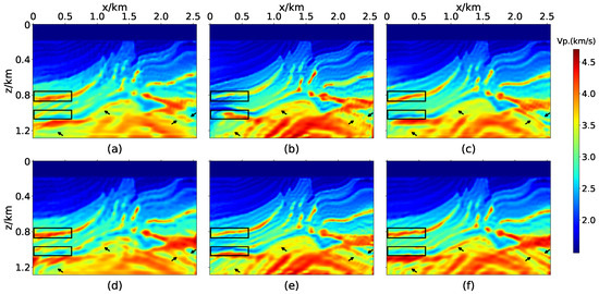 Each single-stage strategy is trained for 4000 epochs, while the proposed two-stage strategy involves training for 2000 epochs per stage. The inversion results are shown in Figure 14. Compared to the inversion results predicted by the MUNet network (Figure 14a–c), the proposed PCAMUNet method (Figure 14d–f) yields significantly higher quality reconstructions. Furthermore, the MUNet-based methods exhibit noticeable waveform information residuals in the regions indicated by black arrows, demonstrating that PCAMUNet effectively processes the relationship between seismic shot gather features and velocity model characteristics. Figure 14a,d do not capture the structure beneath the salt body. Additionally, Figure 14f predicted by the PCAMAUNet with the two-stage strategy is closest to the ground truth, while Figure 14b,c,e fail to capture the structure in the black rectangular boxes. The proposed method more accurately delineates salt body boundaries with sharper transitions and geometric morphologies closer to the true model.