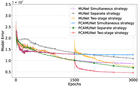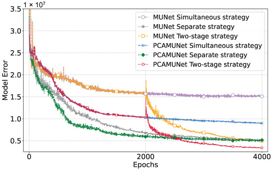 The model error curves on the BP model test. Each curve accounts for different training strategies using different networks: the purple curve is a simultaneous strategy using MUNet; the gray curve is a separate strategy using MUNet; the orange curve is a two-stage strategy using MUNet; the blue curve is a simultaneous strategy using PCAMUNet; the green curve is a separate strategy using PCAMUNet; and the red curve is the proposed two-stage strategy using PCAMUNet.