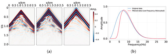 As for the missing low-frequency experiment, Figure 18a displays the original observed shot gather, the filtered shot gather after applying a high-pass filter to attenuate frequencies starting from 5 Hz, and the corresponding difference. The central shot is selected for comparison. Figure 18b shows the amplitude spectra of the shot gathers for comparison.