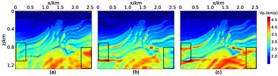 Figure 19 shows the velocity models predicted under the influence of observed shot gathers with missing low-frequency information using traditional multiscale FWI (Figure 19a), the PCAMUNet network with two stages but based on waveform loss with time weighting (Figure 19b), and the proposed PCAMUNet with the two-stage strategy (Figure 19c). Result (Figure 19b)demonstrates that the two-stage strategy performs effectively even when low-frequency information is absent from the observed marine data, as long as waveform-based loss is utilized during training. Moreover, Figure 19c demonstrates that the proposed hybrid loss, combining both waveform-based and envelope-based losses, achieves better accuracy, particularly recovering high-velocity structures. Furthermore, compared to traditional multiscale FWI, the proposed method produces results closer to the true values and better handles structural details in edge regions, as shown in the areas marked by black rectangles.