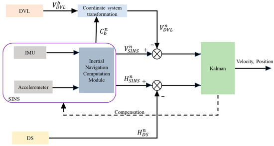 Figure 2. SINS offers continuous information on velocity, attitude, and position relative to the n-coordinate system. The information collected by the DVL includes three-dimensional velocity measurements in the body coordinate system b, which are transformed into the n-coordinate system using a coordinate transformation matrix. The inputs to the Kalman filter observation equations include the differences between velocity values derived from SINS and the DVL, along with the differences between depth values from SINS and the DS.