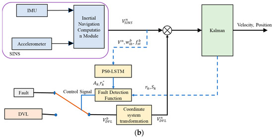 In the model training phase, the PSO-LSTM model is trained on the Kalman filter’s innovation and variance obtained under normal operating conditions of the integrated navigation system, along with the sensor data from the SINS. In the fault detection phase, the trained LSTM model is employed to predict the innovation and variance based on the SINS sensor data. The LSTM-predicted results are then compared with the Kalman filter’s innovation and variance and subsequently input into the fault detection function to evaluate the system status and generate corresponding control signals. Using Equations (8) and (9), the Kalman filter’s innovation and variance , as well as the LSTM-predicted innovation and variance , are derived.