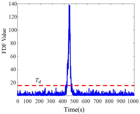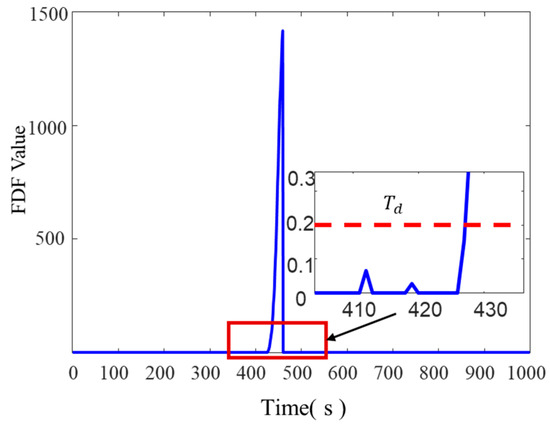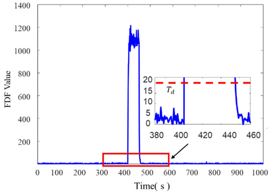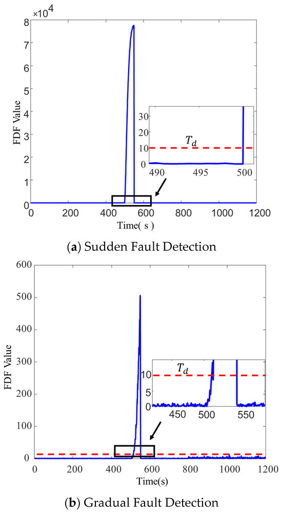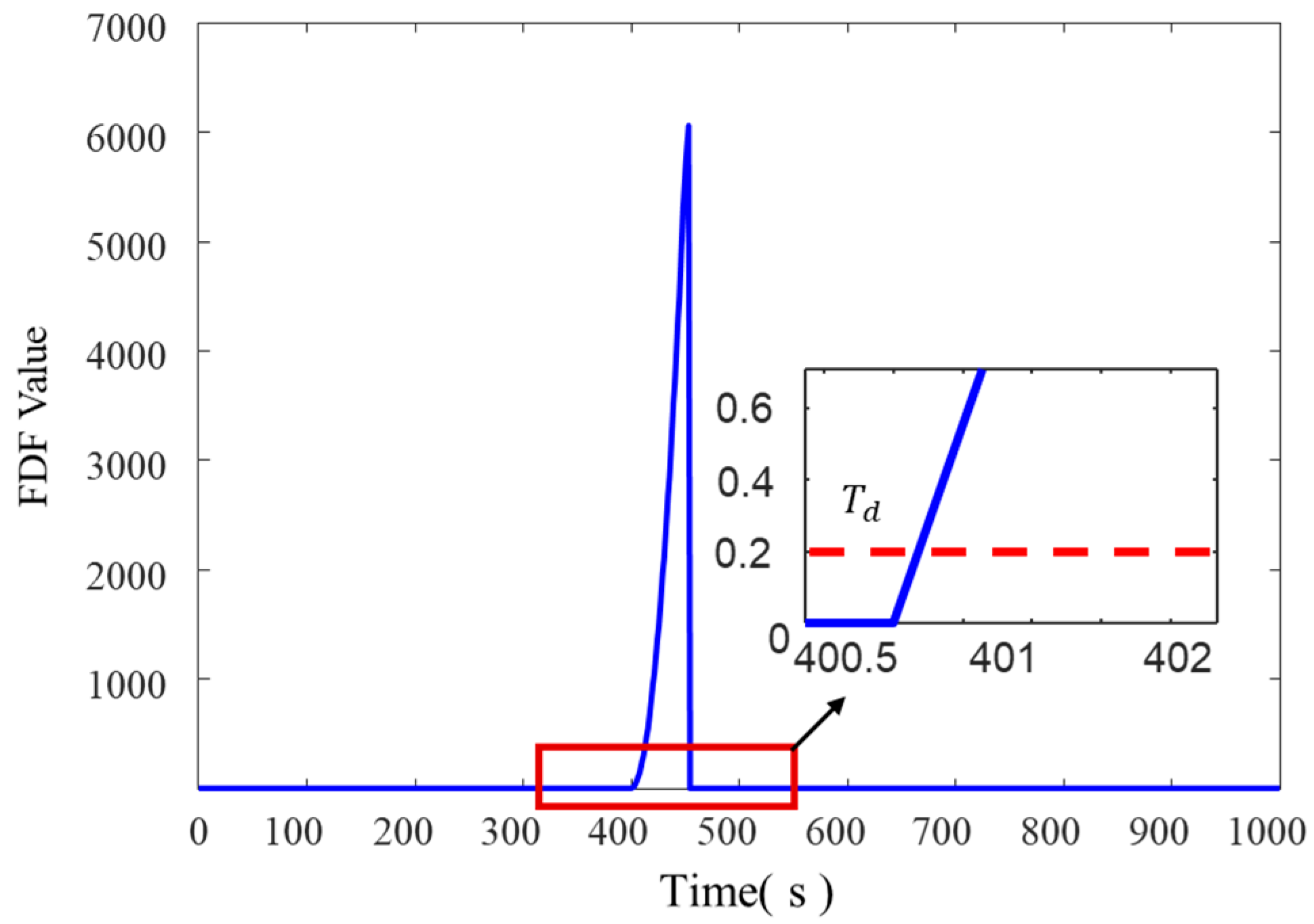 Figure 8. Due to the sudden increase in the data collected by the DVL, the FDF values for both fault detection methods exhibited rapid and significant variations. Both methods successfully detected the fault at 400 s, indicating strong capabilities of both methods for detecting sudden faults.