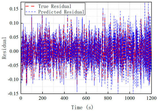 Figure 12, the predicted residuals produced by the trained model are in close agreement with the actual residuals derived from the test set, with both sets exhibiting a consistent temporal trend. The high degree of overlap between the two curves suggests that the model has successfully captured the temporal and statistical characteristics of the residual signal during training. This close alignment not only demonstrates the model’s accuracy in reproducing system behavior under nominal conditions but also indicates its strong generalization capability to previously unseen data. The consistency in both amplitude and phase of the residuals further supports the suitability of the model for reliable anomaly or fault detection in practical navigation scenarios.