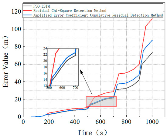 Table 3 was introduced into the DVL of the SINS/DVL-integrated navigation system for simulation experiments, comparing the PSO-LSTM model with the residual chi-square and error coefficient-amplified cumulative residual methods in detecting gradual faults. Since the experimental data were collected in the same water area, the detection thresholds for all methods were uniformly set as previously defined. During the fault detection effectiveness testing, when a fault is detected in the integrated navigation system, fault isolation is conducted, leveraging the underwater acoustic positioning data from the Snapir.