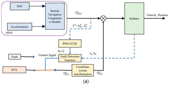 Analytical model-driven fault detection techniques are employed to extract fault information from a system under the assumption that its mathematical model is known. This technique may be categorized into distinct types, including state observation methods, parameter estimation methods, and equivalent space methods [3,4]. The state estimation method is implemented within the framework of a Kalman filter system and utilizes residual or state observers for fault detection [4]. Liu et al. utilized t-test and decoupling matrix methods to identify faults in gyroscopes and accelerometers [5,6]. Zhu et al. employed the chi-square test to exclude abnormal values from external sensors in integrated navigation systems [7]. Chu et al. developed a sliding mode observer, which was applied to fault reconstruction in underwater thrusters [8]. The parameter estimation method is primarily used to identify faults by analyzing the statistical characteristics of changes in system inputs and model output parameters. Mu et al. utilized variational Bayesian theory to estimate the measurement error covariance of t the Doppler velocity log (DVL) within an integrated INS-DVL navigation system and employed Euclidean distance to identify abnormal measurements [9]. Jin et al. proposed a tightly coupled approach employing an adaptive Kalman filter to dynamically estimate observation noise [10]. Yao et al. utilized statistical similarity measures to quantify the similarity between two random vectors derived from the DVL, developing a cost function to retain measurement information [11]. The equivalent space method detects faults by categorizing abnormal data. However, fault detection in real-time navigation systems requires continuous monitoring, but the equivalent space method depends on offline data from the integrated navigation system, rendering it unsuitable for real-time applications and thereby limiting its practical utility. Analytical model-based fault detection algorithms are commonly used in integrated navigation systems, although these methods depend on the accuracy of model parameters, and their detection thresholds are typically determined through engineering heuristics.