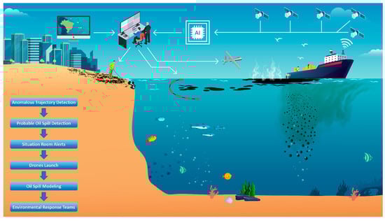 The integration of AI in detecting unusual ship trajectories is crucial for combating illegal oil spills, especially during nighttime operations when satellite-based oil detection is more challenging [21]. Vessels involved in illicit activities often use tactics such as applying dispersants, disabling AIS, altering routes, and operating under the cover of rain or darkness to evade detection [22,23].