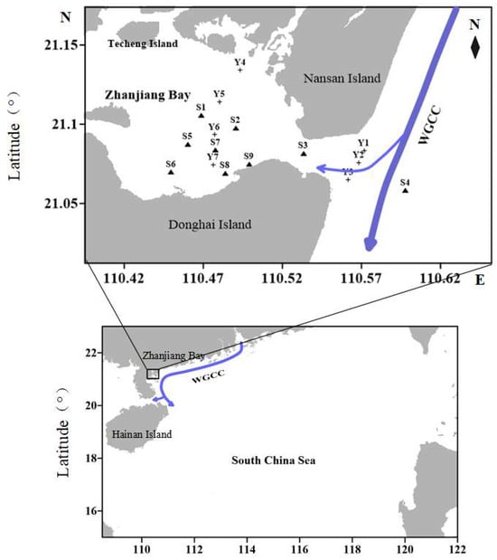 The study area is located in the lower bay of Zhanjiang Bay, Guangdong Province. Zhanjiang Bay is a typical semiclosed bay. The West Guangdong Coastal Current (WGCC) affects the seawater in Zhanjiang Bay []. The WGCC has higher salinity in the outer bay (the northwestern SCS) and transports these waters into the bay via a narrow channel [] (Figure 1). The samples were collected in all four seasons. In 2009, surveys were conducted in February (winter), May (spring), August (summer), and November (autumn), and a total of seven survey stations were set up (Figure 1, Y1–Y7). During 2019–2020, the samples were collected in October 2019 (autumn), January 2020 (winter), April 2020 (spring), and July 2020 (summer), with a total of 9 survey stations deployed (Figure 1, S1–S9). In this study, we define the period from October 2019 to July 2020 as 2019.