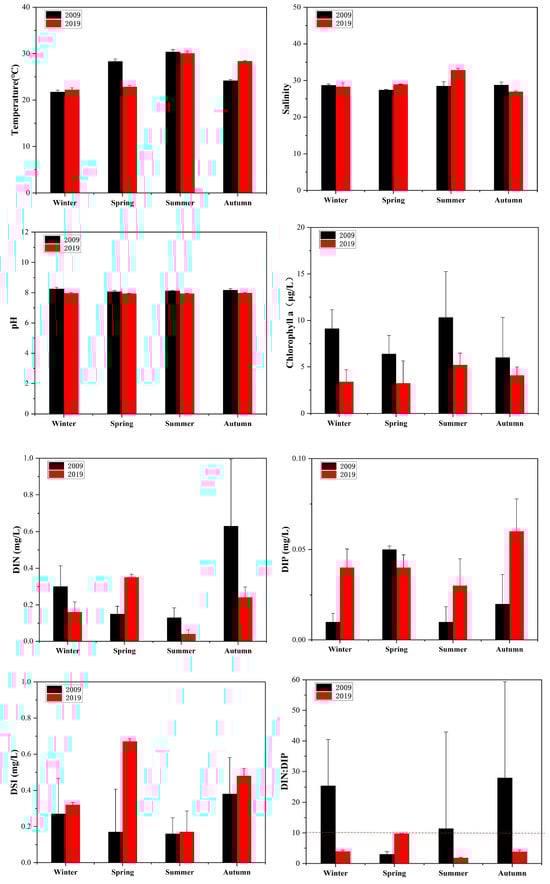 In 2009, the surface water temperature varied greatly (from 21.7 °C to 30.4 °C, average of 26.1 °C) in Zhanjiang Bay during the sampling period. The salinity was relatively high and uniform (from 27.41 to 28.76, average of 28.34). The pH ranged from 8.07 to 8.25 (average of 8.15), and the chlorophyll a (Chla) concentrations ranged from 6.00 to 9.11 μg/L (average of 7.95 μg/L). The nutrient concentrations ranged from 0.130 to 0.630 mg/L (average of 0.302 mg/L) for DIN, 0.012 to 0.050 mg/L (average of 0.024 mg/L) for DIP, and 0.158 to 0.384 mg/L (average of 0.247 mg/L) for DSI. The DIN/DIP, DSi/DIP, and DIN/DSi ratios ranged from 3.0 to 25.4 (average of 16.9), 3.2 to 24.0 (average of 13.2), and 0.89 to 3.72 (average of 2.21), respectively. The t-test showed a significant difference in DIN between 2009 and 2019 in summer (t = 2.316, p < 0.05).