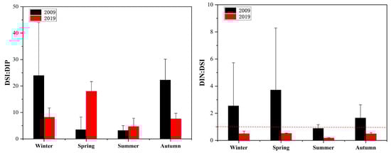 The criteria established by Justić et al. (1995) [] and Dortch et al. (1992) [] were used to assess the stoichiometry of nutrients in seawater. When DSi/DIP > 22 and DIN/DIP > 22, it indicates potential P limitation; when DIN/DIP < 10 and DIN/DSi < 1, it indicates potential N limitation; and when DSi/DIP < 10 and DSi/DIN < 1, it indicates potential Si limitation. The results of the present study revealed low nitrate concentrations during a significant part of the year (2019). Additionally, the DIN/DIP ratio in the upper layers was lower in 2019 than in 2009. The average DIN/DIP ratio in 2009 was 16.9, much higher than 10 and lower than 22; however, in 2019, it was 4.7, much lower than 10. In addition, the average DIN/DSi ratio in 2009 was 2.21, which was higher than one, and the average DIN/DSi ratio in 2019 was 0.46, which was lower than one. The average DSi/DIP ratio in 2009 was 13.2, which was greater than 10, and that in 2019 was 9.7, which was close to 10. This indicates that there was no potential nutrient limitation that limited phytoplankton productivity and growth in 2009; in contrast, in 2019, there was potential N limitation.