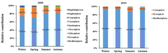 The phytoplankton species composition and the percentage of each algal group that contributed to phytoplankton in the different seasons are shown in Figure 3. In 2009, the total number of phytoplankton species was highest in spring (95 species) and lowest in winter (42 species), and those in the other two seasons were 72 and 66 in summer and autumn, respectively. However, in 2019, the total number of phytoplankton species was the highest in summer (47 species), followed by autumn (37 species), then spring and winter (18 species). The percentage of diatoms ranged from 70.53% to 81.94% in 2009, and the highest percentage occurred in summer, whereas the lowest percentage occurred in winter. The percentage of diatoms ranged from 89.36% to 94.44% in 2019, and the highest percentage occurred in winter and spring, whereas the lowest percentage occurred in summer. The percentage of Pyrrophyta ranged from 12.50% to 23.16% in 2009 and 5.41% to 8.51% in 2019.