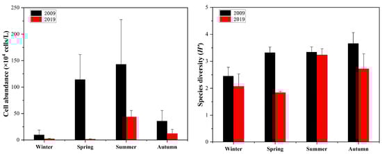 The seasonal variations in the average phytoplankton cell abundance in 2009 and 2019 are shown in Figure 4. The seasonal variation in phytoplankton cell abundance in 2009 decreased in the following order: summer (143.064 × 104 cells/L) > spring (114.285 × 104 cells/L) > autumn (35.821 × 104 cells/L) > winter (9.607 × 104 cells/L). The abundance of phytoplankton cells ranged from 9.61 to 143.06 × 104 cells/L in 2009, with a mean value of 75.69 × 104 cells/L. The seasonal variation in phytoplankton cell abundance in 2019 decreased in the following order: summer (43.788 × 104 cells/L) > autumn (12.124 × 104 cells/L) > winter (2.375 × 104 cells/L) > spring (1.576 × 104 cells/L). The abundance of phytoplankton cells ranged from 2.38 to 43.79 × 104 cells/L in 2019, with a mean value of 14.97 × 104 cells/L. The t-test showed a significant difference in phytoplankton abundance between 2009 and 2019 in summer (t = 5.273, p < 0.001).