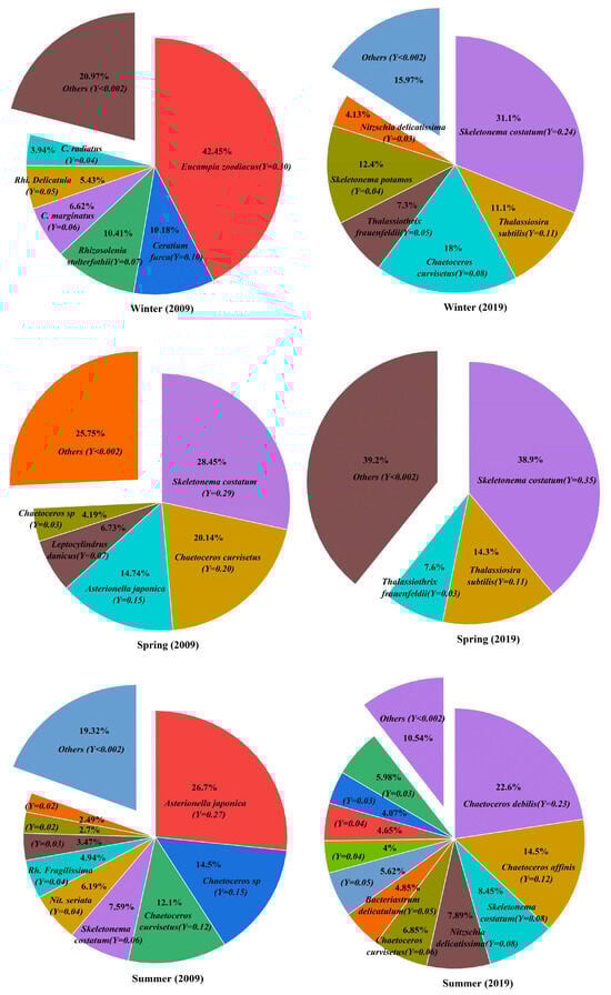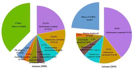 We compared the seasonal variations in the dominant species (Y ≥ 0.02) in 2009 and 2019 (Figure 5). There was little difference in the number of dominant species in 2009 and 2019, which were 15 and 16, respectively. In 2019, the dominant phytoplankton species were all diatoms, and species with strong adaptability to high temperatures and salinity were dominant. Among them, the dominant species with the most significant number in winter, spring, and autumn was Skeletonema costatum, accounting for 31.10%, 38.9%, and 39.5% of the total cell number, respectively. Skeletonema costatum was the dominant species throughout the year.
