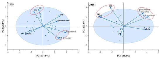 In 2009, the cell abundance of phytoplankton was high in summer and spring, whereas it was low in autumn and winter. In 2019, high phytoplankton cell abundance occurred in summer and autumn, whereas low values occurred in spring and winter. This is the same as the trend of temperature and the opposite of the nutrient trend (Figure 2 and Figure 4). To further understand the key environmental factors affecting the seasonal variation in phytoplankton cell abundance in Zhanjiang Bay, PCA was used to analyze the correlations between them. (Figure 6). Three principal components with eigenvalues exceeding 1.0 were identified for both years. The first component accounted for 37.0% and 45.8% of the total variance in 2009 and 2019, respectively, whereas the second to third components explained 28.5% and 23.1% and 14.8% and 16.5% of the total variance in 2009 and 2019, respectively. The phytoplankton cell abundance exhibited significant negative correlations with nutrients (DIN and DSI in 2009, DIN, DIP, and DSI in 2019) but a significantly positive relationship with temperature. These results indicate that the temperature and nutrient concentrations strongly contributed to the seasonal variation in phytoplankton cell abundance.