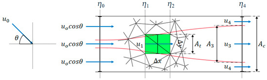 Thus, when shallow water equations are the governing equations, Equation (5) should be revised as follows: