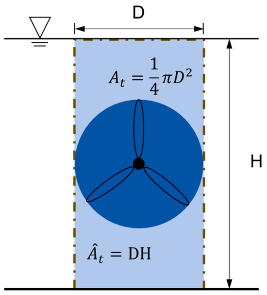 However, in the two-dimensional nonlinear shallow water model of Thetis, turbines are parameterized as regions of enhanced bottom friction. As noted by Kramer and Piggott [23], in a depth-averaged model, the turbine thrust force is actually distributed among a larger region, , than the turbine’s rotation area, . The difference between and is shown in Figure 2. By defining the thrust coefficient of a two-dimensional turbine as , the relationship between and can be expressed as:
