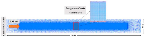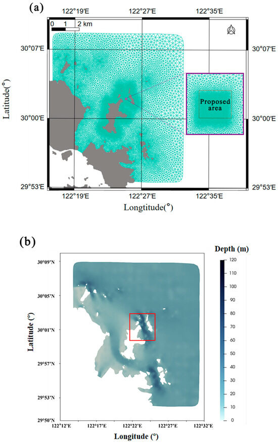 The computational domain is shown in Figure 4. The longitude range of the computational domain is 122.26° E to 122.53° E, and the latitude range is 29.89° N to 30.15° N. As shown in Figure 4a, the red rectangular area within the purple enlarged frame is the proposed area where the tidal stream turbines will be deployed. In order to fully capture the impact of the turbine on the tidal stream, the minimum grid cell size at the proposed area is set to 5 m, which is supposed to be less than 1/4 of the turbine diameter. Similar settings can also be found in previous studies [25,26]. The grid size on the land boundary of Putuoshan and Hulu Island is 50 m, and the grid size on other land boundaries is 200 m. The computational domain contains 20,648 grid nodes and 40,492 grid cells. The QMesh software package [27] is used to generate a Gmsh-compatible mesh file for subsequent simulations in Thetis [28].