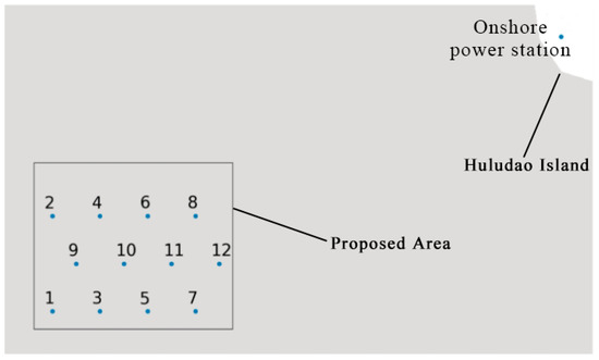 Among all the cases, 12 tidal stream turbines are initially deployed in the “4-4-4” staggered layout within the proposed area, as shown in Figure 5.