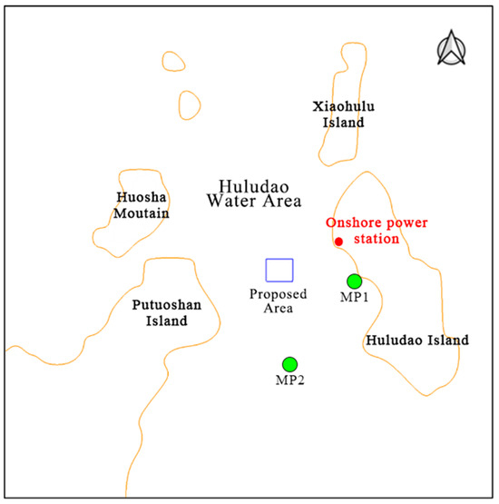 The location of the measuring points, MP1 and MP2, and the onshore power station within Huludao Water Area.