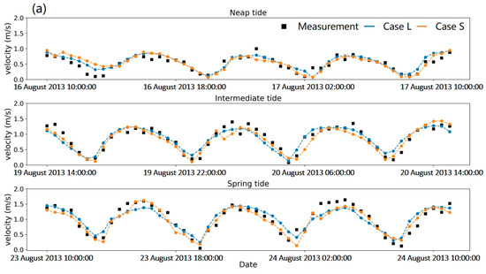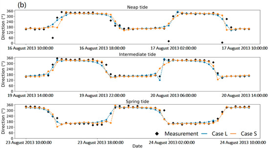 Figure 8a,b compare the simulated and measured tidal flow velocity and flow direction. The results confirm that both Case L and Case S exhibit comparable accuracy in simulating tidal flow velocity, with good agreement observed relative to the field measurements. As shown in Table 1, Case L achieves the lowest RMSE for tidal flow velocity during the neap tide, at 0.126 m/s; however, it also exhibits the highest error in flow direction, reaching 44.3°. In contrast, during the intermediate tide, the RMSE for tidal flow velocity increases slightly to 0.149 m/s, while the error in flow direction decreases significantly. For Case S, the RMSE values for flow velocity during both neap and intermediate tides are nearly identical, at approximately 0.156 m/s. Similarly, the error in flow direction during the intermediate tide is significantly lower than during the neap tide. The largest RMSE in simulated tidal flow velocity for both cases occurs during the spring tide.