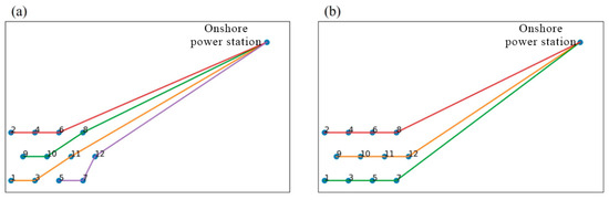 The optimal linking between inland electrical station and turbines: (a) maximum linking number per cable is 3, (b) maximum linking number per cable is 4. The numbered blue solid dots represent the turbines. The red, green, yellow, and purple lines represent four submarine cables.