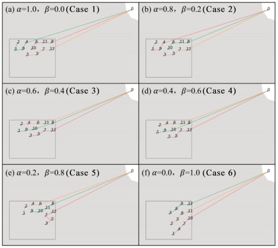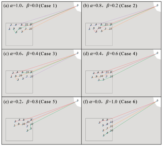 Figure 15 displays the optimal layout of the turbine array and the corresponding optimal cable connection sequence for the six cases of Scenario 1, when the cable capacity is 3 turbines. As can be seen in Figure 15, when the optimization prioritizes maximizing array power output without accounting for submarine cable length, the spacing in east–west direction between the turbines reaches its maximum. This substantial lateral spacing is advantageous as it enables the front row of turbines to effectively extract tidal energy while enabling the staggered arrangement of the back row of turbines to face undisturbed incoming flow, thereby enhancing overall capacity efficiency.