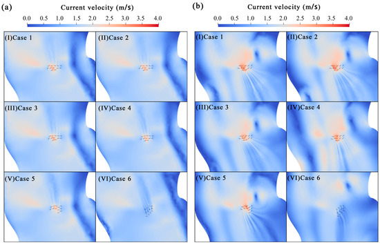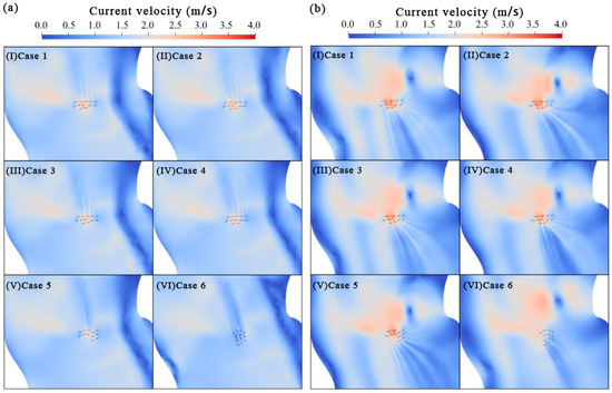 The schematic diagram of the yaw condition for each turbine and the velocity distribution around the turbine array in 6 cases of Scenario 2. (a) at the peak of spring tide, (b) at the peak of ebb tide.