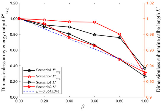 Figure 19 shows the changing trend of the dimensionless array power output and the dimensionless submarine cable length with the weight coefficient in both scenarios. As can be seen, in both scenarios, the dimensionless submarine cable length decreases linearly with the increase of , with a slope of around 0.645. This indicates that the variation in the cable capacity in the connecting turbines has little influence on the change trend of with .