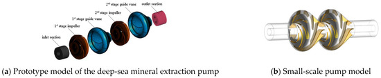 To verify the applicability of the DPM and SST turbulence model for analyzing the performance metrics output and flow characteristics of deep-sea mineral extraction pumps, a scaled-down model of a deep-sea mineral extraction pump was developed based on geometric similarity principles. The primary parameters of the small-scale pump are as follows: head, = 30 m; rated flow rate, = 20 m3/h; rated rotational speed, = 2860 r/min; and rated efficiency, = 64%. To enhance the hydraulic efficiency of the mining pump, the impeller model was designed using the increased flow method. The prototype model of the deep-sea mineral extraction pump is shown in Figure 1a, and the small-scale pump model is shown in Figure 1b.