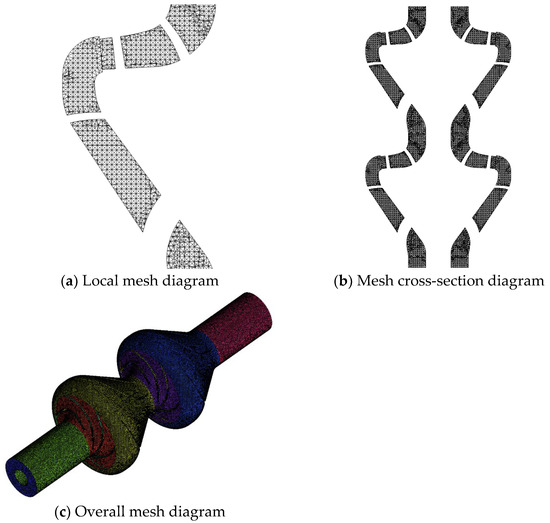 To increase the accuracy of the numerical calculations, the inlet and outlet pipes of the small-scale mineral extraction pump were extended to 1.5 times their respective diameters. The ICEM 2018 software was used to generate the mesh for the entire computational domain before performing numerical calculations. To validate the scientific basis of the mesh division, six sets of meshes with varying densities were generated. The relationship between the number of meshes and the variation in the pump’s external characteristics was analyzed to serve as the foundation for the mesh independence check. Table 1 illustrates the correlation between the number of meshes and the pump head. When the total mesh count exceeded 3 million, the head variation rate of the pump was controlled within 1%. Therefore, the total number of computational meshes was determined to be approximately 3 million.