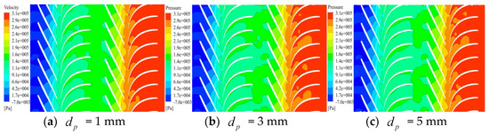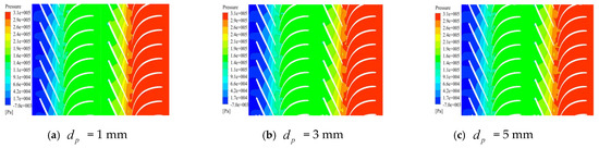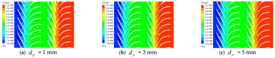 The internal pressure distribution of the mineral extraction pump for different particle sizes under the high flow rate condition is shown in Figure 7. The pressure distribution exhibited a similar trend to that under the rated and low flow conditions but with a more stable gradient. Comparing the three cases revealed that particle size had a relatively small effect on the pressure distribution under the high flow rate condition.
