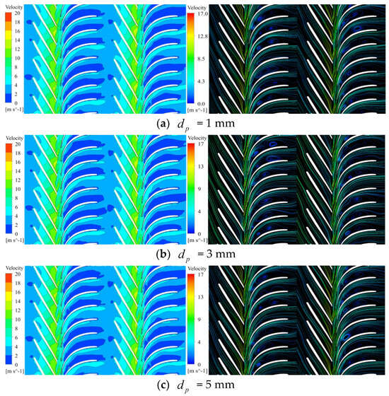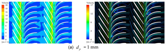 The velocity cloud and streamline distribution inside the pump under different particle sizes under the low-flow rate condition is shown in Figure 4. Regardless of the particle size, the fluid entered the impeller with a relatively uniform velocity from the pump inlet. Owing to the rotational work of the impeller, two clear velocity increases were observed in the first- and second-stage impeller regions of the computational domain. However, as the fluid entered the region of the space guide vane, its velocity decreased. Localized vortex flows appeared in the transition area between the impeller outlet and the space guide vane inlet, as well as within the flow passage of the space guide vane. This caused flow instability, leading to chaotic flow patterns and backflow phenomena in these regions. The backflow at the impeller outlet occurred because high-energy fluid was expelled radially from the impeller outlet and converted into axial motion through the transition section between the impeller and the space guide vane. This change in flow direction inevitably deteriorated the flow pattern. Within the region of the space guide vane, as the cross-sectional area of the flow passage increased in the axial direction, the fluid velocity decreased significantly, leading to flow instability and increased flow losses.
