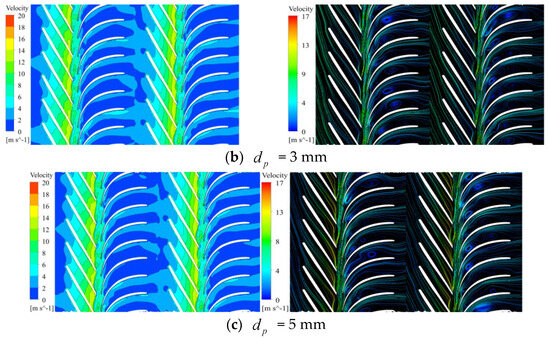 The velocity cloud and streamline distribution inside the mineral extraction pump for different particle sizes under the high flow rate condition is shown in Figure 8. Compared with the low and rated flow conditions, the velocity gradient inside the pump was more uniform. Moreover, vortex and backflow phenomena within the first- and second-stage space guide vanes were significantly weakened. This reduction in flow instability led to lower hydraulic losses and increased hydraulic efficiency. Comparing Figure 8a–c reveals that as the particle size increased, the vortex intensity within the space guide vane increased significantly, along with an expansion of the unstable flow region.