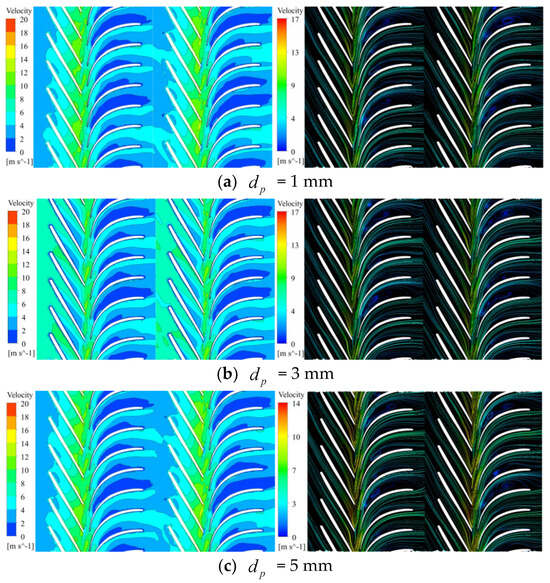 The velocity cloud and streamline distribution inside the pump for different particle sizes under the rated flow condition is shown in Figure 6. The velocity inside the impeller increased with the radius. As the fluid entered the space guide vane, its velocity decreased because part of the kinetic energy was converted into pressure energy. Within the space guide vane, the accumulation of solid particles on the vane surface and rapid changes in the vane angle weakened the vane’s ability to control the flow field. This resulted in clear flow instability phenomena such as vortex formation, backflow, and secondary flows, causing significant hydraulic losses within the guide vane. Additionally, as the particle size increased, the influence of solid-phase particles on the liquid-phase flow became more pronounced, leading to an expansion of the vortex region within the space guide vane.
