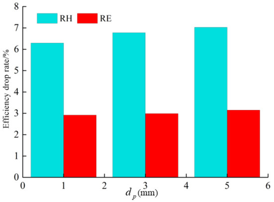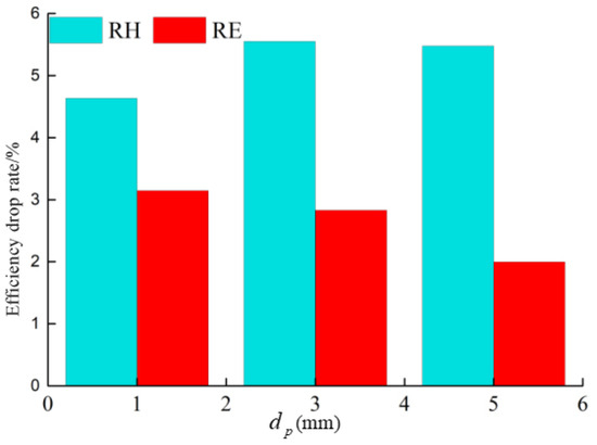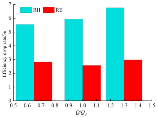 Figure 11 illustrates the variation in pump performance when conveying solid particles of different sizes. As the size increased from 1 to 5 mm, RH increased, while RE essentially remained the same. This indicated that under the high flow rate condition, the solid particle size was positively correlated with the head drop rate but had a small impact on efficiency. Specifically, the head drop rate RH increased from 6.3% at a particle size of 1 mm to 6.8% at 5 mm, while the efficiency drop rate RE remained nearly constant at 2.9%.