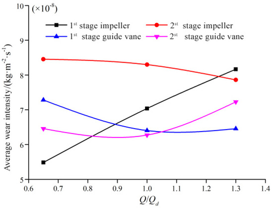 Figure 12 illustrates the influence of the flow rate on the surface wear intensity of the four main flow passage components when the pump conveyed a solid–liquid two-phase flow with a particle size of 3 mm. As the flow rate increased, the wear intensity of the first-stage impeller and the second-stage guide vane increased, and the wear intensity of the second-stage impeller decreased. The wear intensity of the first-stage guide vane initially decreased and then increased. This trend reflects the complex relationship between motion parameters, such as flow rate and particle size, and the wear intensity of flow passage components.