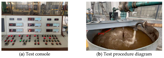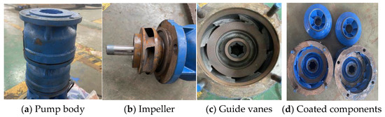 This test served as a validation of the methodology. Considering the actual flow passage conditions of the test pump, we conducted experiments using 3 mm particles, and the test concentration was 7.5%. The test was conducted under the rated flow condition (20 m3/h). The applicability of the method was mainly verified through wear tests. Prior to the test, a uniform layer of water-based paint was applied to the inner wall of the impeller flow passage. Once the paint had completely dried, the test was commenced. Following 2 h of unstable flow within the passage, the extent of particle-induced erosion on the flow passage was assessed. Thereafter, the experimental findings were juxtaposed with the numerical simulation results under identical boundary conditions. The test site is shown in Figure 16.