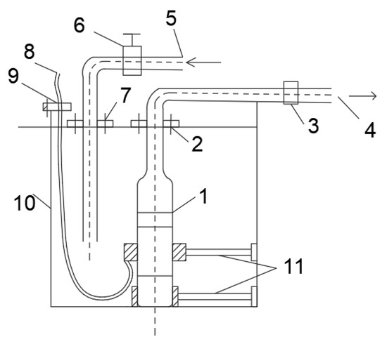 Schematic diagram of the experimental system. 1—Experiment pump (including motor); 2—Experiment-pump support mechanism; 3—Flow meter; 4—Outlet pipe; 5—Return pipe; 6—Regulating valve; 7—Return-pipe support member; 8—Cable terminal; 9—Cable fixing component; 10—Water tank; 11—Anti-submersible pump swing component.