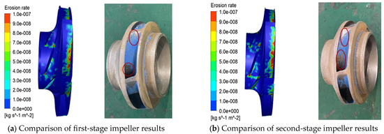 With the DPM and SST turbulence model, the wear characteristics of the pump were analyzed using the same boundary conditions as in Section 2.2.3. We compared the numerical simulation results with the experimental results, as shown in Figure 17.