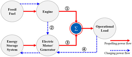 In a land vehicle system, where hybrid electric propulsion was first applied, the power flow of the hybrid electric propulsion system is illustrated in Figure 1 [11]. Hybrid electric propulsion systems using different power sources can provide the power for operations by combining engines and electric power (case 1+3) or can charge the battery using the engine (case 2). However, since regenerative braking is impossible for ships, recovering operational load as electric energy is impossible (case 4). Therefore, compared to land vehicles, the strategies for distributing and managing hybrid power may be different. The algorithm for distributing and controlling power between the internal combustion engine and electric power corresponds to sigma (Σ) in Figure 1. The hybrid power control strategy controls the propulsion output at the center of different power sources and, in some cases, adjusts the energy flow accordingly.