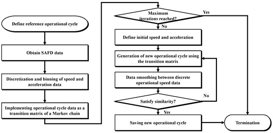 The driving or operating state of mobility systems is known to follow the Markov property, where the current state is determined by the immediately previous state [22]. In land vehicles, these Markov properties are used to generate standardized driving cycles [23,24]. In previous studies on these systems, actual vehicle driving data is first collected and segmented into smaller data sections with similar characteristics. After composing the segmented drive cycles into modal events of acceleration, deceleration, cruise, and idle modes, a new driving cycle is generated assuming that each modal event has a Markov property. Finally, among the generated driving cycles, the one with a speed–acceleration frequency distribution (SAFD) that is most similar to the actual driving data is selected as the standardized driving cycle.