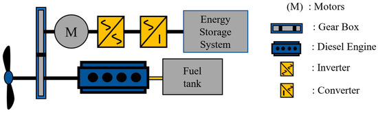 Achieving compliance with these regulations ultimately requires the electrification of propulsion systems [4]. However, depending on the type of ship or the operating profile, there may be limitations in securing total propulsion power using only electrified propulsion. For ships that need to travel long distances or require high propulsion power immediately, the capacity and cost of the energy storage system (ESS) limit their ability to meet the load demand of all-electric propulsion systems. In addition, all-electric propulsion still contains technical limitations, including insufficient charging infrastructure, energy management systems, and operational safety, which must be resolved before it can be applied in large mobility systems such as ships. For cases requiring immediate high propulsion power or power necessary for medium- to long-distance operations, a hybrid electric propulsion system that combines an internal combustion diesel engine with a battery-based electric propulsion system can be considered an appropriate solution [5]. The combination of marine diesel engines and batteries is one of the most widely used hybrid configurations.