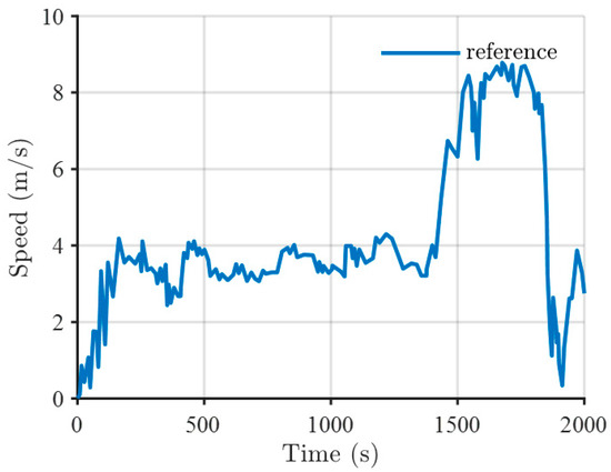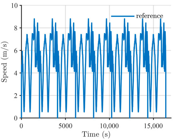 The stochastic power control strategy developed in this study can achieve consistently high performance even under variable load conditions. To validate this, performance was evaluated using a new operational dataset that was not included in the training data from the KT River. The new operational dataset follows the speed profile shown in Figure 17. For relative comparison with the stochastic power control strategy, the commonly used load leveling technique was applied to the same operational profile. Based on the previous dynamic programming (DP) results, the load leveling method sets to −0.5 for demanded powers exceeding 100 kW to increase the engine’s power rating. For demanded power below 100 kW, electric propulsion is considered more efficient, so is set to 1, allowing operation in electric mode. Additionally, to maintain the SOC, the SOC correction factor is applied in the same way as the stochastic power control strategy.