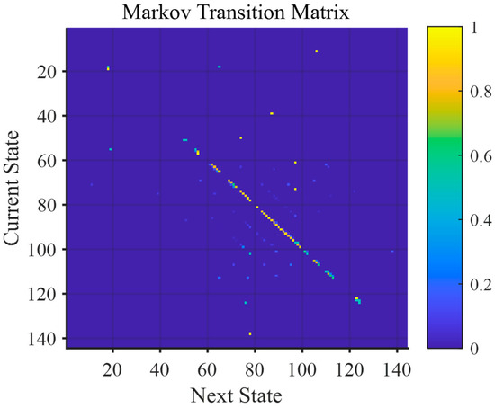 In the SAFD, each combination of speed and acceleration is defined as a state, and the transition frequency between states is counted based on the time series operational data. By normalizing the transition frequencies between states, a Markov transition matrix can be constructed. Figure 6 presents a visualized graph of the Markov transition matrix generated.