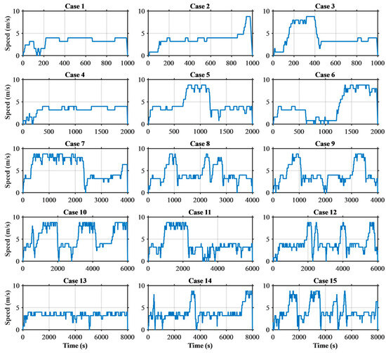 The operational data shows that the vessel primarily operates at a speed of 3–4 m/s but accelerates to 8 m/s in the final segment to return to the port. The total operating time is 2000 s (approximately 33 min) per cycle. If the hybrid power control strategy is optimized based on the operational data in Figure 4, the speed of 3–4 m/s would account for the largest proportion of operation. Thus, the control strategy is likely to be optimized for this operating point. Additionally, considering the high-speed return condition in the later phase, the system may reserve electrical energy in advance and use it at the final step for more efficient operation. However, if the maximum speed operation time changes or the proportion of operation at 3–4 m/s varies, a power distribution control strategy optimized for a specific operational dataset may show suboptimal performance. Therefore, this study generated an SAFD based on the representative operational data in Figure 4 and used it to create multiple operational datasets with variations.