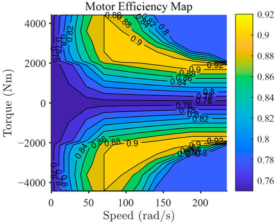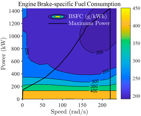 where is the power distribution control variable between the diesel engine and the electric motor. When approaches 1, the electric motor primarily supplies the propulsion power, and when approaches 0, the diesel engine becomes the main power source. When approaches −1, the motor operates like a shaft generator, utilizing the surplus of the engine load to charge the power. The maximum outputs of the diesel engine and electric motor are 1440 kW and 450 kW, respectively, and the efficiency maps of each power source are shown in Figure 8 and Figure 9. The ship was assumed to be a 71,000 kg recreational boat.