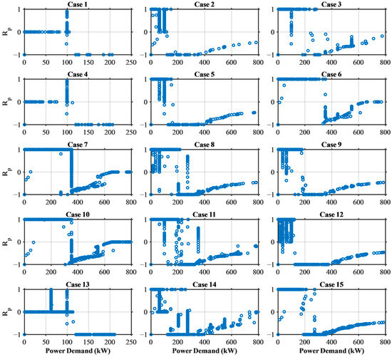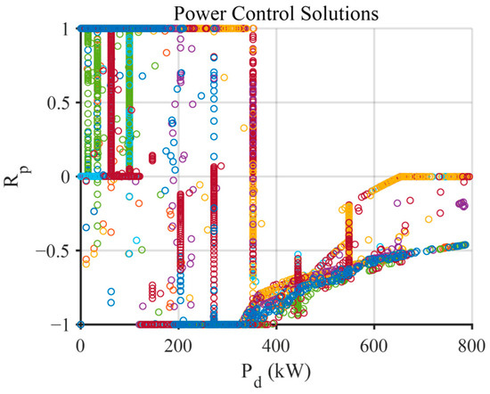 Even with deviations in the operational data, the control solution for demanded power shows a slight fluctuation range, but overall, it shows a form similar to Figure 11. Generally, for demanded power between 100 kW and 400 kW, remains at 1, indicating a preference for electric propulsion. For demanded power above 400 kW, increasing the engine power rating to operate at an efficient operating point while using surplus power for charging is more efficient. Specifically, the engine’s optimal efficiency point can be determined by reducing the engine power rating while considering the characteristics of the engine’s efficiency map as the required power increases. However, it can be confirmed that the is not determined in the demanded power of 0~800 kW, but rather, various control options are selected even in the same demanded power, such as the demanded power condition of 350 kW or less. If a single deterministic control strategy is established based on demanded power, the optimal solution may not be selected under various operational conditions. Therefore, in this study, the control solutions for 150 operational conditions were integrated to develop a probabilistic map of control solutions based on demanded power, allowing for selection based on probability.