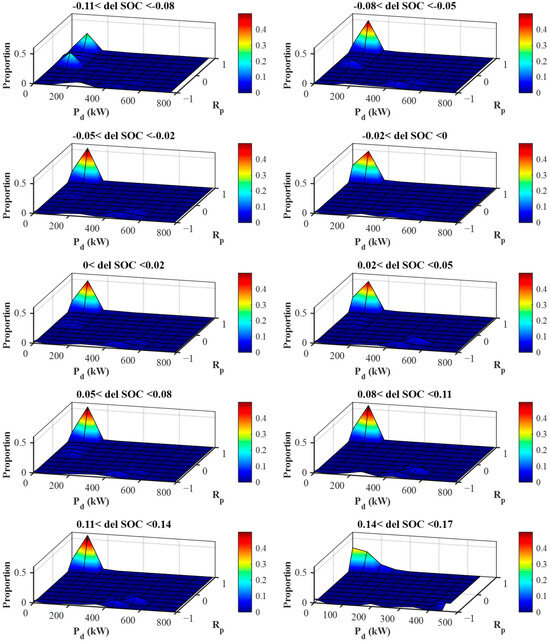 represents the proportion of electric propulsion power used in the total propulsion power. When the battery SOC is sufficient, electric propulsion is primarily utilized without fuel consumption, resulting in being close to 1. Conversely, when the SOC is low, is reduced to minimize battery discharge. Therefore, after compiling all the optimal control solutions derived from dynamic programming, the control solutions were reorganized into a stochastic map based on the SOC state and demanded power. The SOC state was classified according to its deviation from the final target SOC value. As shown in Table 2, the SOC states were divided into 24 bins. However, since bins 1–8 and 19–24 did not contain any corresponding SOC states, the stochastic map was ultimately established for 10 bins, as illustrated in Figure 12. The color scale represents the probability density of each combination of demanded power and , in a given . Warmer colors indicate more frequently selected control actions under dynamic programming results.