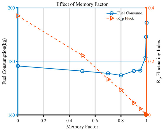 where is the power distribution control solution obtained from the stochastic control map, represents the final power distribution control solution from the previous calculation step, and is the final power distribution control solution selected in the current step. α is the memory factor. As the memory factor approaches 1, the variation from the previous power distribution control solution becomes smaller. An excessively high memory factor may degrade the control strategy’s performance. Depending on the memory factor, the variability of was quantified using the average of the derivative of (fluctuating index), and the total fuel consumption was evaluated. As shown in Figure 15, as the memory factor increases and approaches 1, the variability of decreases linearly. However, total fuel consumption rises sharply when the memory factor exceeds 0.95. This indicates that when the memory factor increases beyond a certain threshold, the reflection of the optimal control solution slows down, ultimately degrading performance. Therefore, to minimize fluctuations while keeping the increase in fuel consumption to a minimum, the memory factor was set to 0.95.